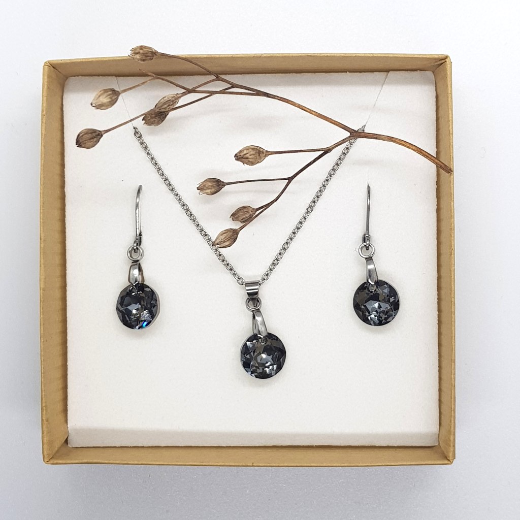 Řetízek cca 46,5 cm (lze upravit) s komponenty Swarovski cca 1 cm. Náušnice celková délka: cca 3,1 cm. Produkt je dodáván v transparentní dárkové krabičce.