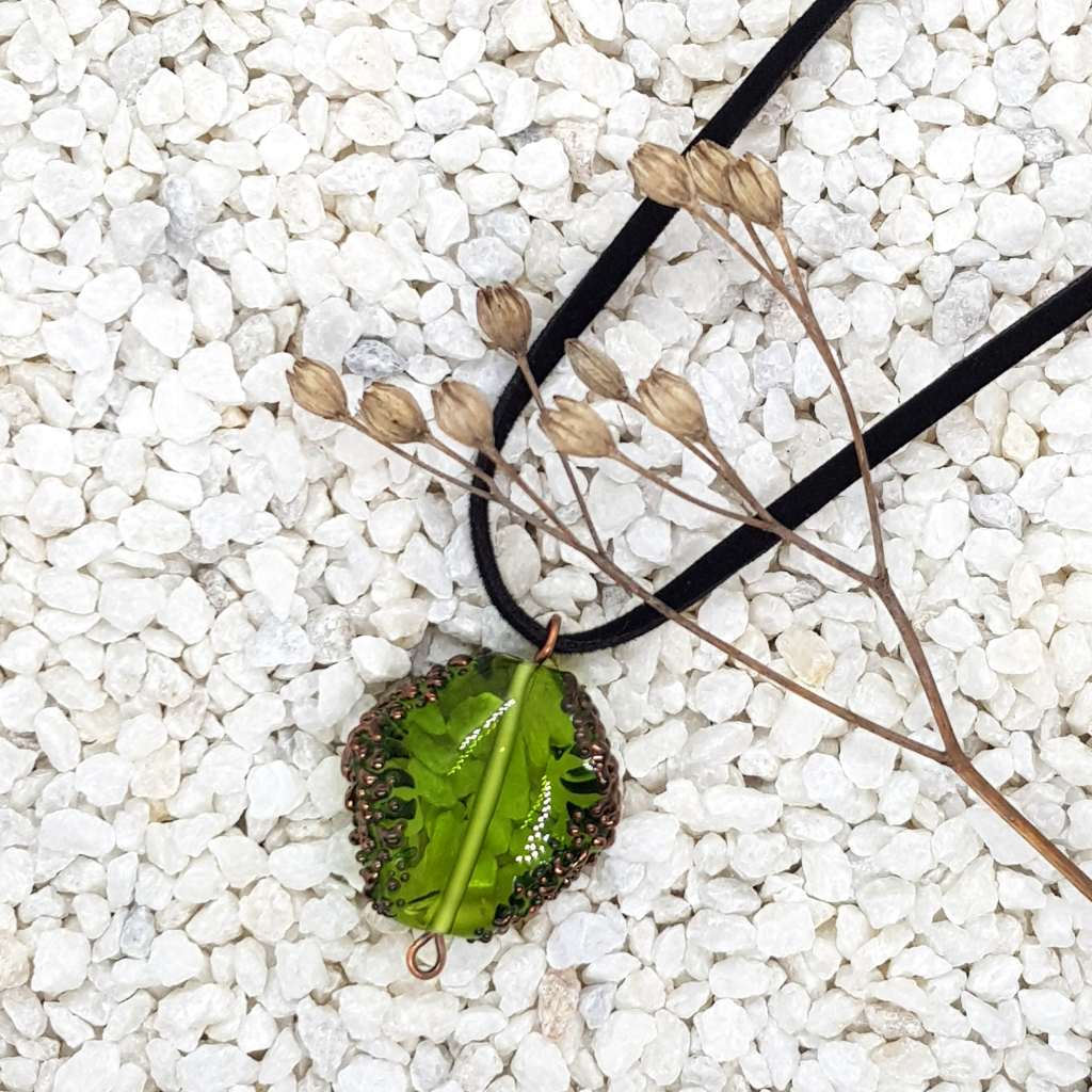 Originální skleněný přívěsek (cca 2,2 cm) na kůži.
