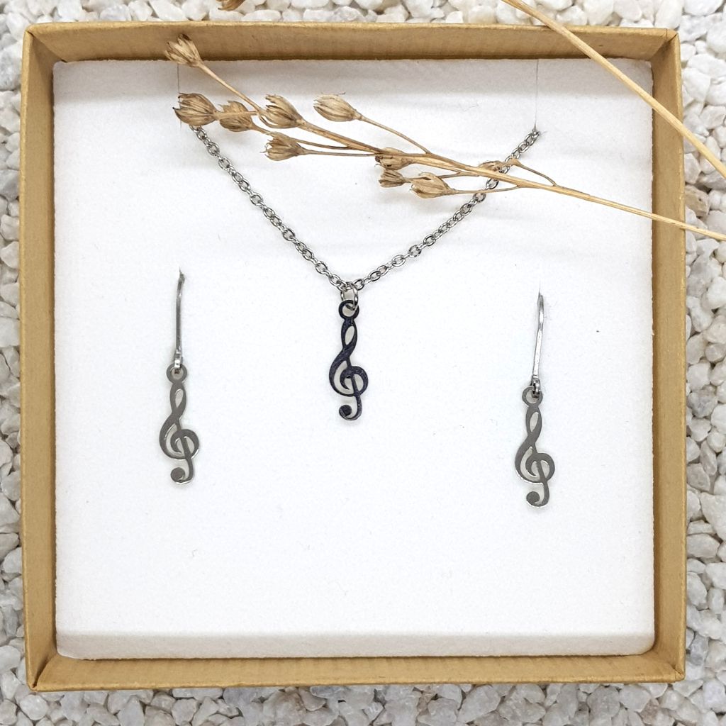 Jemná souprava s houslovými klíči. Velikost přívěsků cca 16 mm. Řetízek cca 47 cm. Produkt je dodáván v transparentní dárkové krabičce.