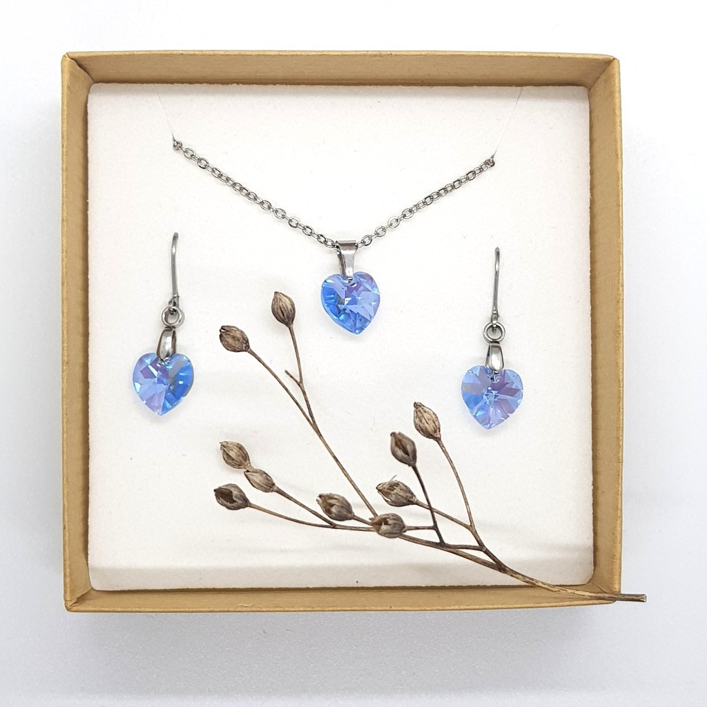 Řetízek cca 47 cm (lze upravit). Náušnice: celková délka: 3 cm. Komponent Swarovski: cca 1 cm. Produkt je dodáván v dárkové krabičce.